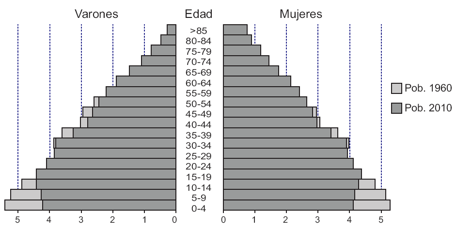 Se observa entre estos años una marcada reducción de la base, fundamentalmente en el grupo etario de entre 0 y 4 años. Entre los 30 y los 49 años se retrajo levemente la población, en mayor medida en el caso de los hombres. Con respecto a la cúspide, la transformación más importante (ocultada por la gráfica) es el aumento en la proporción de mujeres en los grupos etarios mayores a 50 años, fenómeno conocido como “feminización del envejecimiento poblacional”. La proporción de hombres resultó mayor en 2010 con relación a 1960 en todos los grupos etarios a partir de los 55 años.
