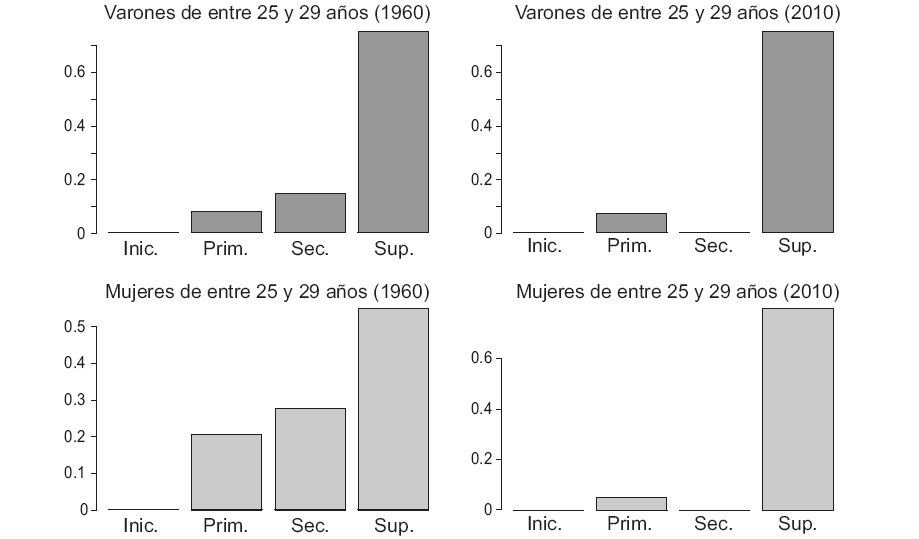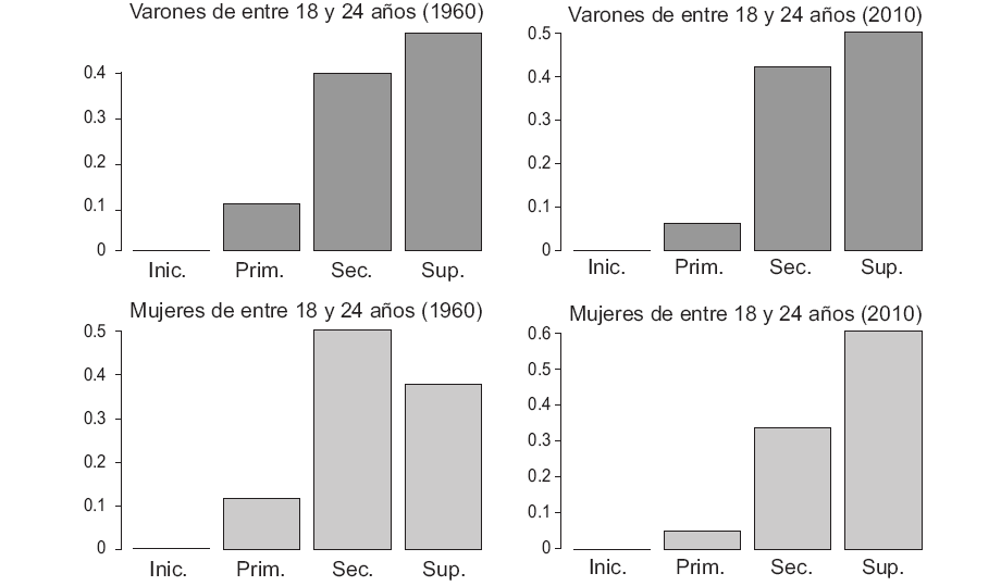 Entre los 18 y los 24 años la transformación en la distribución de la asistencia fue mucho más evidente para las mujeres: en 1960 sólo 38% de las jóvenes asistía a un nivel superior o universitario, mientras que en 2010 lo hacía el 61%, al tiempo que el porcentaje de varones cursando estudios superiores se mantuvo cercano al 50% en ambos años censales. El complemento de esos porcentajes asistía al nivel secundario y en menor medida al primario, con una mayor participación del secundario en 2010 (Gráfica 10)