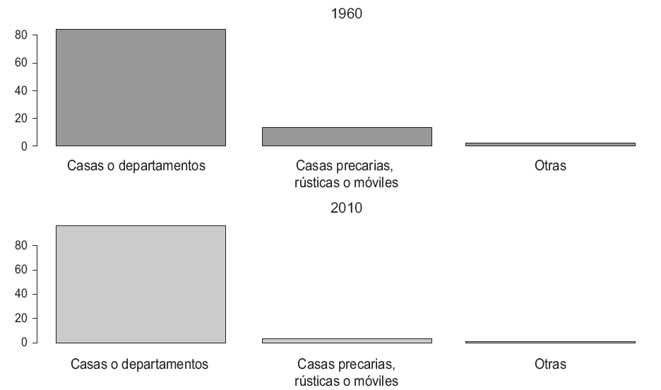 Se observa que entre 1960 y 2010 aumentaron 11% las viviendas construidas como casas o departamentos, al tiempo que disminuyeron 10% las construidas como casas precarias o casillas, casas rústicas o ranchos y casas móviles, y 1% otro tipo de viviendas como piezas de inquilinato o pensión y locales no construidos para vivienda (Gráfica 12).
