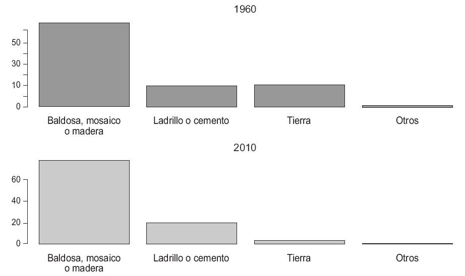Entre 1960 y 2010 aumentaron 12% las viviendas construidas con piso de baldosa o cerámica, mosaico o mármol y madera o alfombrado y 3% las construidas con piso de ladrillo fijo o cemento, al tiempo que disminuyeron 15% las viviendas con piso de tierra o ladrillo suelto. El porcentaje de viviendas con otro tipo de piso no especificado se mantuvo cercano al 1% (Gráfica 13).