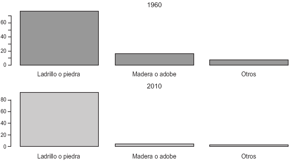 Entre 1960 y 2010 aumentaron 17% las viviendas construidas con paredes de ladrillo, piedra, bloque u hormigón, mientras que disminuyeron 11% las construidas con paredes de madera o adobe y 6% las construidas con paredes de otro tipo como chapa, chorizo,5 cartón, palma, paja o material de desecho y otros tipos no especificados (Gráfica 14).