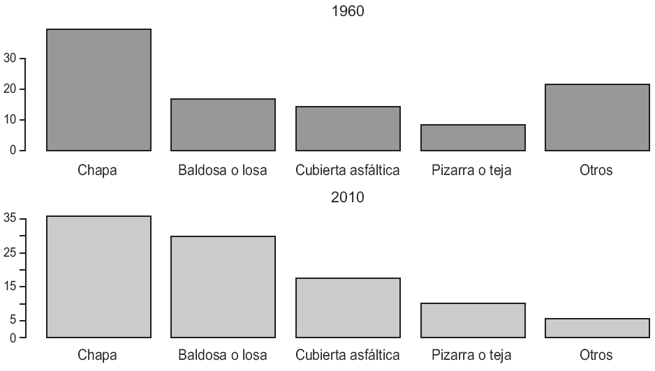 Entre 1960 y 2010 aumentaron 14% las viviendas construidas con techo de baldosa o losa, 4% las construidas con cubierta asfáltica o similar y 2% las construidas con pizarra o teja, al tiempo que disminuyeron 4% las viviendas con techo de chapa y 16% las viviendas con otro tipo de techo como fibrocemento o plástico, cartón, madera o tabla, paja o rama y otros no especificados (Gráfica 15).