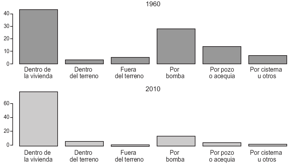 Se observa que entre 1960 y 2010 aumentaron casi 35% las viviendas con agua de red pública dentro de la vivienda, y cerca de 1.5% aquéllas con agua de red pública fuera de la vivienda pero dentro del terreno, al tiempo que disminuyeron casi 4% las viviendas con agua fuera del terreno por grifo público, cerca de 16% las que obtenían el agua por bomba manual o automática, poco más de 10% las que obtenían agua de pozo, agua de lluvia o acequia, y casi 6% las viviendas que adquirían agua de otras fuentes como transporte por cisterna y otras no especificadas (Gráfica 16).