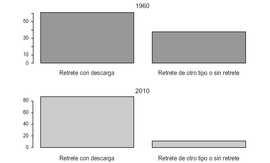 Entre 1960 y 2010 aumentaron 26% las viviendas con disponibilidad de retrete con descarga, al tiempo que disminuyeron en ese mismo porcentaje las viviendas que, o bien no tenían retrete, o bien tenían otro tipo de retrete sin descarga de agua (Gráfica 17).