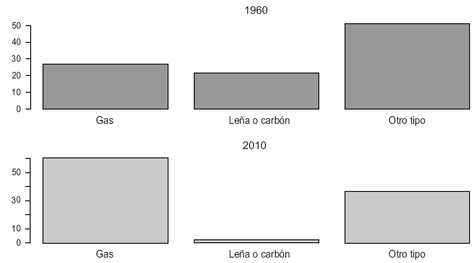 Entre 1960 y 2010 aumentaron 33% las viviendas con cocina a gas, al tiempo que disminuyeron 19% las cocinas a leña o carbón y 14% otros tipos de cocinas como las de kerosene y eléctricas, muchas de las cuales se sustituyeron por el uso de garrafas6 (Gráfica 18).7