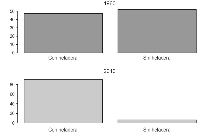 Finalmente, entre 1960 y 2010 aumentaron 46% las viviendas con disponibilidad de heladera (Gráfica 19).
