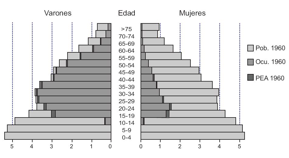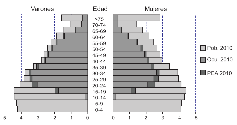 Tanto en 1960 como en el 2010 más del 80% de la PEA en todos los grupos de edad y sexo se encontraba ocupada. El cambio más evidente reside en el aumento sustancial de la participación femenina en la PEA en todos los rangos etarios. En 1960 la proporción poblacional de mujeres en cada rango etario que formaba parte de la PEA aumentaba hasta un máximo de 1.54% en el rango de entre 20 y 24 años (equivalente al 40% de las mujeres de esa edad) a partir del cual comenzaba a disminuir hasta alcanzar apenas un 0.03% en el rango de mayores de 75 (equivalente al 3% de las mujeres de esa edad). En 2010 dicha proporción aumentó hasta un 2.8% en el rango de entre 30 y 34 años (equivalente al 71% de las mujeres de esa edad), a partir del cual comenzó a disminuir hasta alcanzar 0.29% en el rango de mayores de 75 años (equivalente al 10% de las mujeres de dicha edad).
