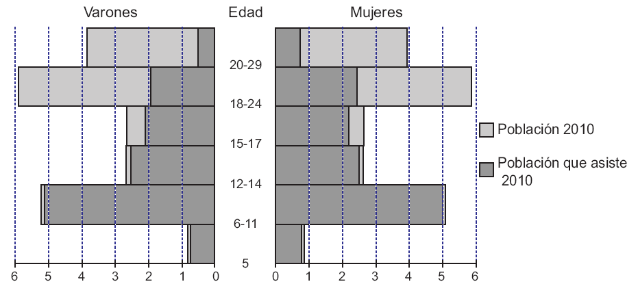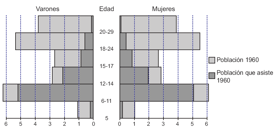 Con respecto a la dimensión educativa, uno de los logros más evidentes de los últimos 50 años fue el aumento de la proporción de la población joven que asiste a un establecimiento educativo. Las Gráficas 4 y 5 expresan el porcentaje poblacional de la asistencia escolar por edad y sexo para 1960 y 2010, respectivamente.