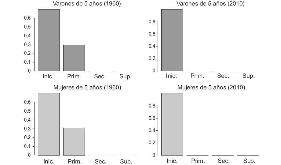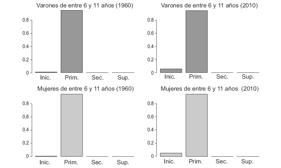 En primer lugar, se observa un cambio en la distribución de la asistencia en niños y niñas de 5 años: mientras en 1960 el 69% de estos niños asistía al nivel inicial y el restante 31% lo hacía al nivel primario, en 2010 casi el 100% asistía al nivel inicial, probablemente por la obligatoriedad del nivel preescolar introducida en 1993 (Gráfica 6).