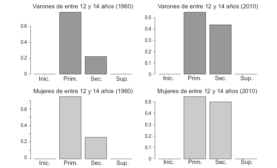 En el grupo etario de jóvenes de entre 12 y 14 años cambió la distribución de la asistencia a favor del nivel secundario: en 1960 el 76% de los jóvenes de esa edad asistía al nivel primario y sólo 24% lo hacía al secundario, incluyendo las escuelas de formación técnica; en 2010 el 54% asistía al nivel primario y el 46% lo hacía al secundario, el cual se sustituyó en algunas provincias por los ciclos de Educación General Básica y Polimodal (Gráfica 8).