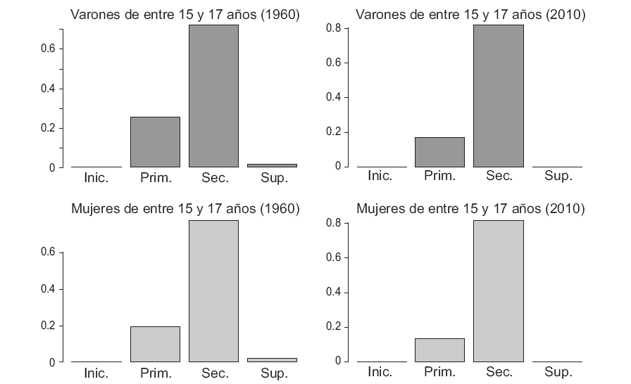 Si se agrupan los niños comprendidos entre los 5 y 14 años no existen diferencias significativas en la distribución de la asistencia a los distintos niveles educativos por sexo, las cuales sí aparecen a partir del grupo etario de jóvenes de entre 15 y 17 años. En 1960 el 72% de los varones y el 76% de las mujeres con edades entre 15 y 17 años asistían al nivel secundario, porcentajes que pasaron a 81 y 85% en 2010, respectivamente; el complemento de estos porcentajes en cada caso asistía al nivel primario (Gráfica 9).