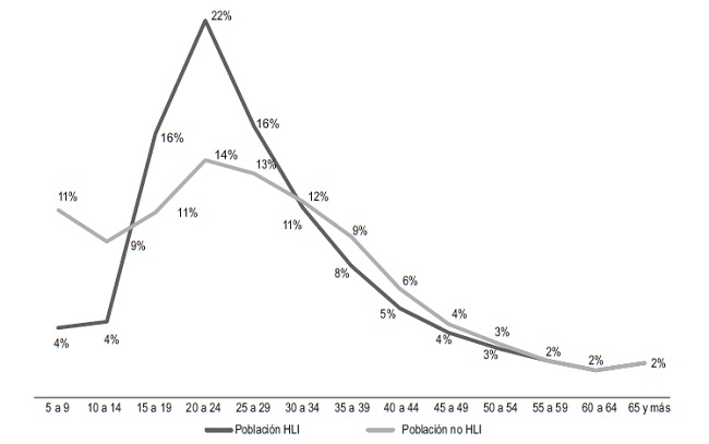 La migración indígena en el año 2015 está constituida principalmente por hombres, más que por mujeres, y el índice de masculinidad de la población indígena migrante es de 112 hombres por cada 100 mujeres. Este índice es lo contrario para los NHLI, ya que para este grupo el flujo migratorio está constituido mayoritariamente por mujeres: algo más de 98 hombres por cada 100 mujeres. Respecto a la edad (véase la Gráfica 1), este flujo de migración indígena se constituye por personas jóvenes que están en el apogeo de sus capacidades físicas; se trata de un patrón de migración laboral donde la distribución por edades muestra una migración tradicional. Esto quiere decir que la curva etaria presenta una concentración en las edades productivas, con una leve participación de las edades infantiles y avanzadas. En cambio, la estructura de edad de los NHLI está más asociada a la migración familiar donde los grupos infantiles y productivos tienen una destacada participación porcentual, mientras que es menor la participación en las edades avanzadas. De esta forma, la migración de los NHLI presenta un patrón más “moderno” relacionado con una migración urbana-urbana. En ese sentido, la motivación para migrar no sólo está relacionada con la búsqueda de empleo o mejores trabajos, sino también con el deseo de la reunificación familiar o el anhelo de mejores ambientes para vivir.