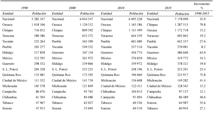 En 1990, las entidades que más perdieron población HLI fueron: Oaxaca, Yucatán, Guerrero, Hidalgo, Puebla, Chiapas, San Luis Potosí y Michoacán. Para 2015 la posición de las entidades expulsoras había cambiado y presentaba este orden: Chiapas, Oaxaca, Guerrero, Veracruz, San Luis Potosí, Yucatán, Puebla, Ciudad de México e Hidalgo. A excepción de la Ciudad de México, estas entidades de emigración han sido el territorio histórico de los mayores asentamientos de población indígena en el país. En esta distribución llama la atención la situación de Chiapas y Veracruz: la primera figuraba en 1990 en la sexta posición, pero en 2015 pasó a ser la primera entidad expulsora de población indígena; la segunda presentaba en 1990 un saldo neto migratorio positivo y destacaba como entidad de atracción, sin embargo, en 2015 se volvió el cuarto estado expulsor. Por otra parte, Michoacán sigue siendo un estado con saldo neto negativo, pero ha ido perdiendo peso; lo mismo sucede con Hidalgo, en tanto la Ciudad de México se colocó dentro de los principales estados expulsores de población HLI en 2015. En lo que sigue damos cuenta de lo que ha sucedido en dichos estados expulsores, centrándonos sólo en aquellos que han sido territorio histórico de HLI.