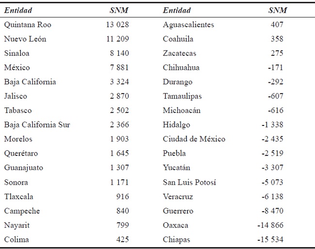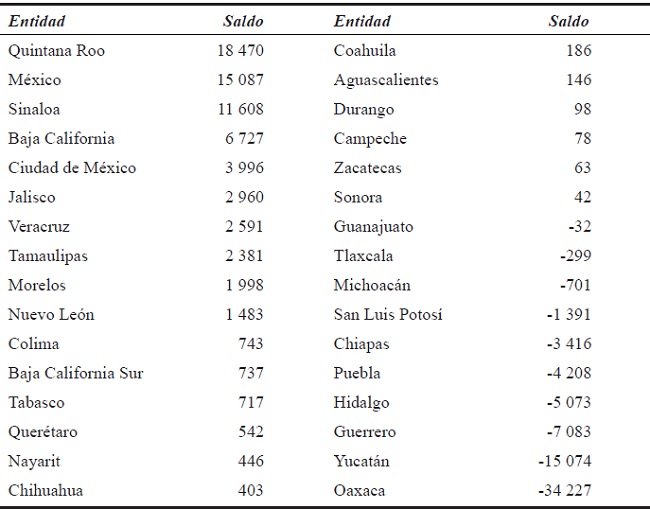 El análisis del saldo neto migratorio (diferencia entre inmigrantes y emigrantes) de los HLI en 2015 nos muestra cuáles son las entidades que ganaron más población indígena y aquellas donde sucedió lo contrario. A partir de este criterio, en los estados donde hubo mayor ingreso de población indígena observamos lo siguiente: a) la permanencia de Quintana Roo como la principal entidad de atracción de migrantes indígenas en el país; b) la consolidación de Nuevo León como entidad receptora de migrantes indígenas; c) el fortalecimiento del Estado de México como entidad que también recibe migrantes indígenas; d) el ascenso de Sinaloa y Baja California como los estados del noroeste del país que más acogieron migrantes indígenas, y e) la emergencia del trabajo agrícola de indígenas en el sureste de Jalisco (véase los Cuadros A1, A2, A3 y A4 en el Anexo). De manera general describimos los perfiles de estos migrantes en cada una de estas entidades.