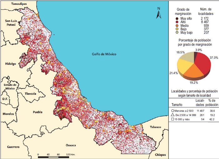 El estado de Veracruz ocupa el cuarto lugar de marginación en el país, después de Guerrero, Chiapas y Oaxaca. En 2010, 2.6 % de los ocupantes de viviendas de la entidad se encontraban sin drenaje ni excusado, y 19.5 % sin agua entubada; 39.9 % de las viviendas presentaban hacinamiento, y 46.2 % de la población estaba asentada en localidades menores de 5 000 habitantes. Del total de localidades, 40.9 % tenía un grado de marginación muy alto o alto, y en su mayoría correspondían a localidades rurales (Conapo, 2010) (véase el Mapa 2).