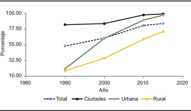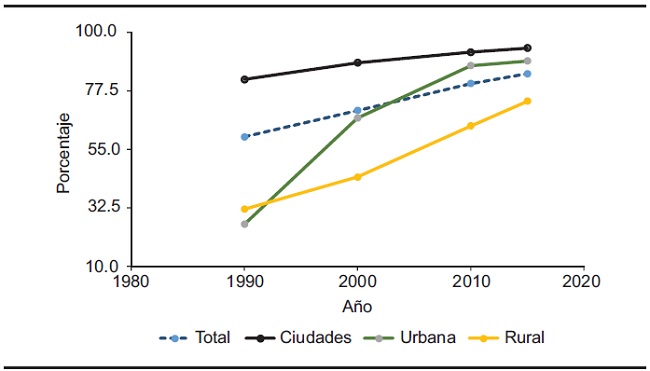 La Gráfica 1 muestra las coberturas del servicio desagregadas por localidades rurales menores a 2 499 habitantes, localidades urbanas de 2 500 a 9 999 habitantes, y ciudades de 10 000 habitantes y más. La cobertura de agua en zonas rurales tiene una tendencia positiva, pero la brecha entre ésta y las de las zonas urbanas y ciudades es considerable: para 2015 las ciudades registraron una cobertura de 94.0 %, mientras que en las localidades rurales fue de 73.5 % (cifra muy inferior al promedio nacional de 82.9 % para las zonas rurales en 2014).