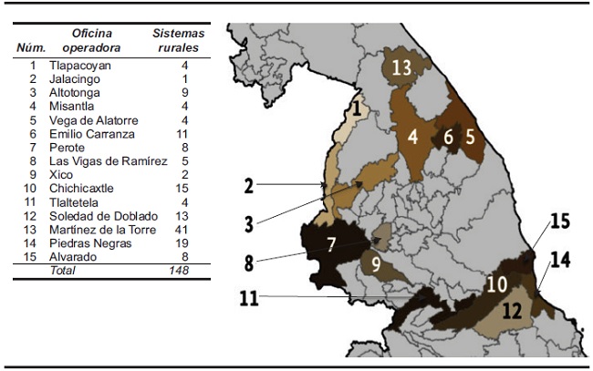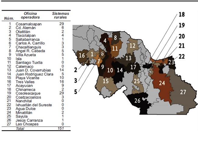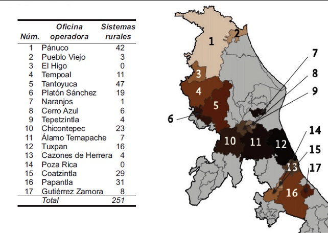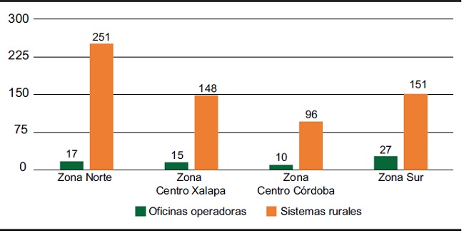 El estado, a través de la CAEV, tiene un papel relevante en la administración del agua potable y saneamiento en las zonas rurales. En la zona Norte, por cada 14.7 sistemas rurales hay una oficina de la CAEV; en la zona Centro Xalapa la relación es de 9.8; en la zona Centro Córdoba es de 9.6; y en la Sur, de 5.5 sistemas rurales por cada oficina operadora. Para 2016 se reportan en total 646 sistemas rurales administrados por la Comisión (véase la Gráfica 3 y los Mapas 3, 4, 5 y 6).