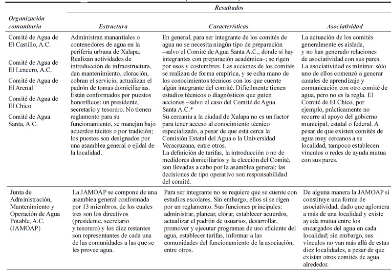 En el Cuadro 1 se muestra una síntesis de los grupos focales y de las entrevistas realizadas a las OCSAS o comités de agua asentados en la Zona Metropolitana de Xalapa, a quienes se les interrogó en relación con su funcionamiento, organización y vínculos con otras organizaciones comunitarias del ramo, para conocer el grado de su organización social.