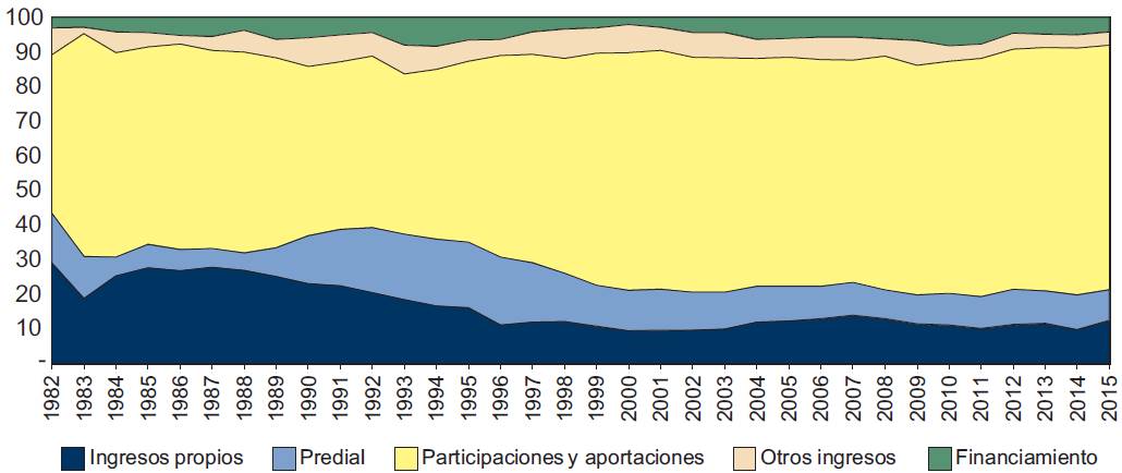 El municipio mexicano ha cambiado mucho desde principios de los años ochenta, cuando inició el proceso de descentralización fiscal. Si bien los cambios propiciados por este proceso y la democratización han tenido un impacto diferenciado en los municipios del país, éstos ahora están sujetos a la competencia política y a un tipo de relaciones intergubernamentales muy distintos de los que primaban hace más de tres décadas. A pesar de estos cambios, el municipio no ha logrado aumentar su autonomía económica como se tuvo en mente al proponerse la reforma del artículo 115 constitucional en 1982 (Silva-Herzog, 1982). Desde entonces, se le delegó la potestad sobre los impuestos inmobiliarios y se establecieron sus responsabilidades de gasto. No obstante, el potencial de recaudación de los municipios, especialmente a través del predial, ha sido desaprovechado en la mayoría de éstos. En la actualidad, la hacienda municipal depende en 70% de las transferencias de la federación y los estados, sólo 21% proviene de ingresos propios (impuestos, derechos, productos y aprovechamientos), y el predial contribuye en apenas 8.8% a los ingresos públicos de la hacienda local (véase la Gráfica 1).
