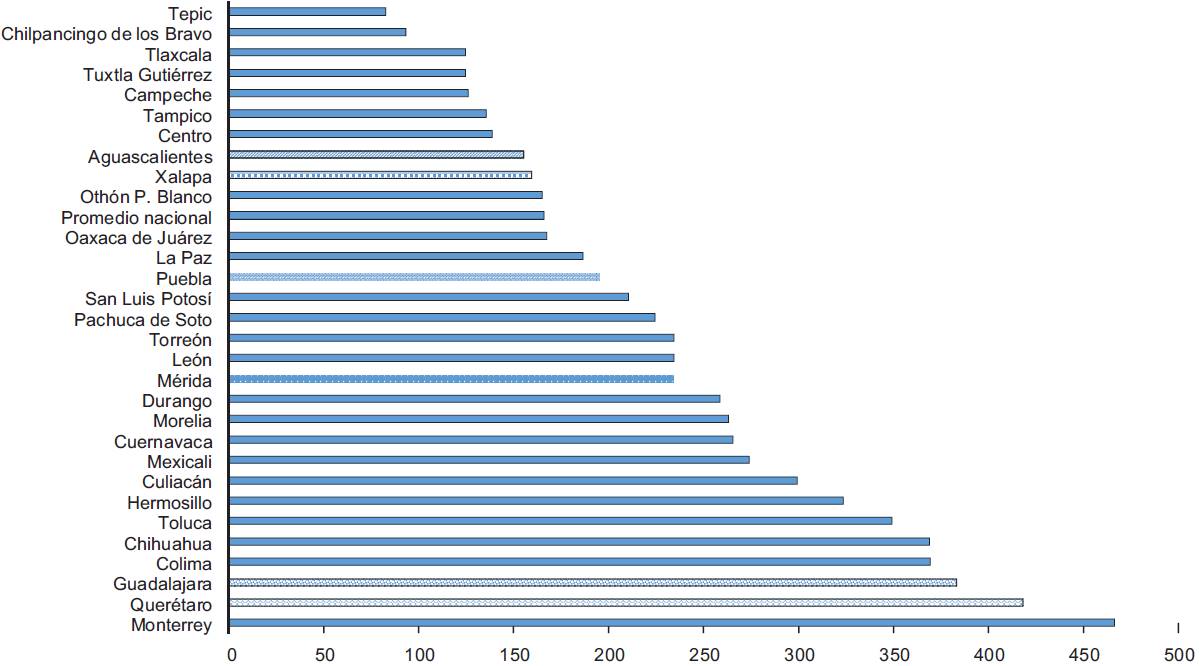 La pareja de municipios de alta recaudación predial son Querétaro y Guadalajara, que en 2010 recaudaron 418 y 383 pesos por habitante y se colocan en el mapa de las capitales estatales en segundo y tercer lugar (véase la Gráfica 4). Mérida y Puebla son la pareja de nivel medio de recaudación: ambos recaudaron 235 y 195 pesos respectivamente. Xalapa y Aguascalientes son el dúo de bajos recaudadores, con 160 y 155 pesos por habitante, y ocupan el lugar 22 y 23 de las 31 capitales.