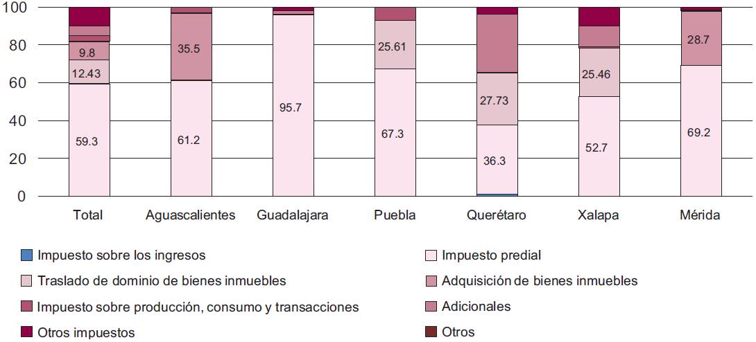 La relevancia de los impuestos de traslado o adquisición de inmuebles son en todos los casos el segundo impuesto más importante después del predial, excepto en el caso de Guadalajara, donde 96% de su recaudación proviene del predial. Este tipo de impuestos es muy importante para Aguascalientes (le da 36% de sus ingresos tributarios) y para los otros cuatro también, pues les aporta de 25 a 28% de su recaudación. Al menos dos hechos llaman la atención aquí: la pasividad de Guadalajara para recaudar a través de otros impuestos y el hecho de que Querétaro es un alto recaudador de predial con todo y que recauda también altos niveles por traslado de dominio e impuestos adicionales.