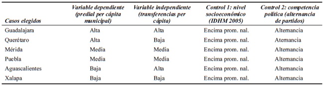 Con objeto de explorar estas variables explicativas se llevó a cabo un estudio de casos, para lo que se eligieron seis municipios urbanos, representativos de los 50 municipios más poblados del país que han experimentado alternancia política y tienen un nivel de desarrollo por encima del promedio nacional. Un small-n study como éste hace posible determinar con mayor detalle los mecanismos que están detrás de los factores que directamente influyen en el nivel de recaudación predial. Un estudio de casos, por el nivel de observación que permite, ofrece una mayor precisión para medir variables independientes de corte político y de capacidad institucional. Las entrevistas que se condujeron a tesoreros, directores de catastro y de ingresos dejan ver las variables que influyen en las decisiones de estos funcionarios para diseñar el impuesto y para cobrarlo. Igualmente, la aplicación de un instrumento de medición de capacidad institucional en las tesorerías y catastros de estas seis ciudades permite valorar qué tan relevante es ésta para la recaudación y por qué.