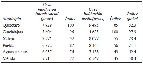 El Cuadro 2 muestra los precios de mercado por metro cuadrado de construcción en los tipos de vivienda más comunes de los municipios: casa habitación de clase interés social y casa habitación clase media. Se calculan los índices de precios comerciales de ambos tipos de vivienda para poder apreciar con claridad qué porcentaje del metro cuadrado de construcción del municipio con mayor valor representa los metros cuadrados de construcción del mismo tipo de vivienda en otros municipios. Así, por ejemplo, el valor del metro cuadrado de construcción de una casa habitación de interés social en Mérida es 72% del valor del mismo tipo de inmueble en Querétaro, que tiene el valor más alto en este tipo. Los datos provienen de la base de datos en línea de la Sociedad Hipotecaria Federal (SHF).8
