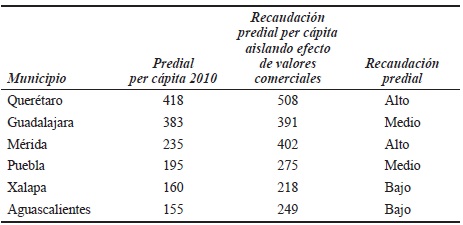 Una manera de apreciar el efecto que tiene la variación de los valores comerciales en la recaudación es aplicando el índice global del valor comercial de los dos tipos de inmuebles más comunes a la recaudación predial de cada uno. El Cuadro 3 nos lo muestra y propone un nuevo ranking en la recaudación de los casos de estudio. Querétaro y Mérida serían los que más recaudan (508 y 402 pesos, respectivamente), seguidos por Guadalajara y Puebla (391 y 275 pesos), y como los más bajos recaudadores estarían Aguascalientes y Xalapa con 249 y 218, respectivamente.