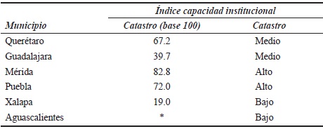 En términos de la capacidad institucional del catastro, Mérida es el que tiene mejor nivel (con un índice de 83), le sigue Puebla. El hecho de que Xalapa es el peor calificado y que Aguascalientes no tiene catastro municipal coincide con que son también la pareja con más bajos niveles de recaudación. Por otro lado, es de sorprender que Guadalajara tenga un nivel tan pobre en su índice catastral.