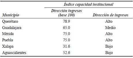 En cuanto a la capacidad institucional de las direcciones de ingresos, se aprecia que la de Querétaro es la que cuenta con más elementos para cobrar el predial de manera más efectiva y eficiente, pero Mérida y Puebla no se quedan atrás en los esfuerzos realizados en estas áreas. Guadalajara muestra una capacidad institucional en su dirección de ingresos mediocre, ocupando el cuarto lugar. Xalapa y Aguascalientes son de nuevo los que reciben la calificación más baja.