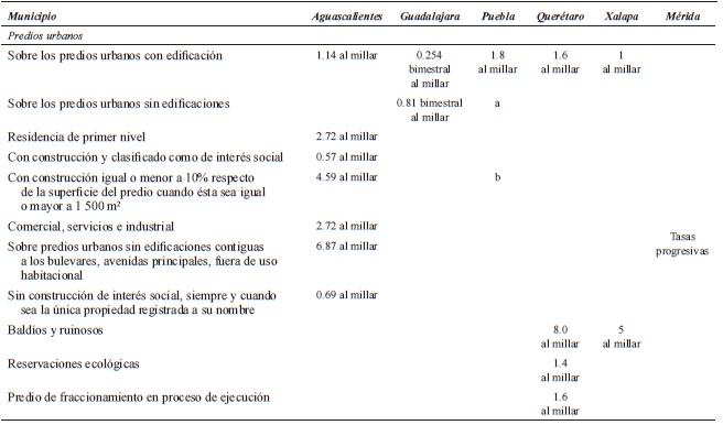 Algunos municipios, como Aguascalientes, Guadalajara, Querétaro y Puebla, aplican una tasa más alta a los predios baldíos o sin construcción, lo que busca desincentivar el especular con la tierra, no tener terrenos ociosos cuando hay necesidades de desarrollo habitacional y evitar que los baldíos se conviertan en focos de infección (basureros al aire libre). En cuanto al uso de los predios o inmuebles, sólo Aguascalientes aplica una tasa especial para los predios comerciales, de servicios o industriales. De hecho, sólo ocho capitales del país diferencian entre predios habitacionales y comerciales, aplicándoles una tasa diferente. Sin embargo, esto ha abierto la puerta para que los contribuyentes que pagan una tasa más alta disputen el tratamiento que se les da y se amparen tratando de no pagar. Bajo esta lógica, Aguascalientes, que es el municipio que tiene tasas diferenciadas según el tipo de inmueble, sufre de muchas demandas de amparo interpuestas generalmente por los contribuyentes grandes.25