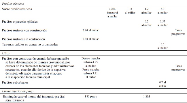 A continuación, se describirá la estructura de tasas en cada uno de los seis municipios estudiados, lo que nos permitirá apreciar la variación que existe entre los casos de estudio. Según el Cuadro 6, Mérida es el único municipio que en su estructura de tasas responde a principios de equidad y proporcionalidad. De hecho, en el país sólo 11 de las 32 capitales cuenta con un predial progresivo. Mérida tiene una estructura de tasas progresiva con cuotas fijas y tasas marginales; considera dos bases: el valor catastral y la contraprestación por arrendamiento aplicando el impuesto a la base que implique el mayor monto. En cambio, los demás municipios imponen una tasa única a cualquier predio, independientemente del valor del mismo.