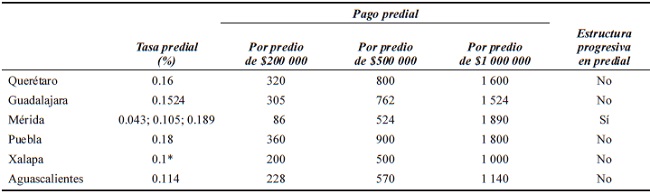 El Cuadro 7 busca hacer evidente la diferencia de tasas en cada municipio y sus implicaciones para la recaudación. La tasa única más alta la tiene Puebla (1.8%), le sigue Querétaro (1.6%) y luego Guadalajara (1.524%). Mérida, en contraste, es el municipio que recauda menos de los inmuebles de menor valor (86 pesos) y más de aquellos más costosos (1 890 pesos); es decir, es el único que tiene una estructura de tasas progresiva.