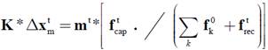 La inversión de capital para la reconstrucción, K * Δxtcap, se calcula como la participación de la demanda de reconstrucción entre la demanda final total, multiplicada por la producción restante después de satisfacer la demanda intermedia, (χttp − Axttd), como se muestra en la Ecuación 6: