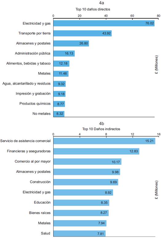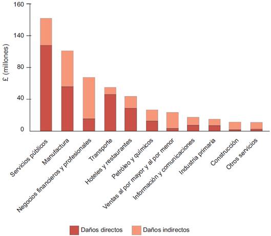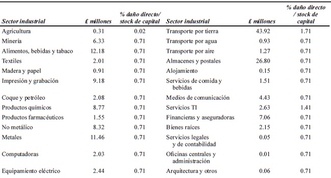 Para los daños al capital industrial, el informe indica un costo total de £138 millones para locales comerciales, inventarios, equipo, etc. Además, los £148 millones de daños a la infraestructura se distribuyeron entre los sectores de transporte; servicios de tecnologías de la información; electricidad y gas; agua, alcantarillado y residuos; administración pública y defensa (PAD, por sus siglas en inglés), educación, y salud. Dado que la desagregación sectorial de los daños fue para 46 categorías, se asignó el valor del daño a cada sector industrial a través de una distribución ponderada basada en la participación del sector en la economía regional. Estos datos se compararon con el capital industrial para determinar la proporción de la capacidad productiva afectada; es decir, se estima el daño productivo a cada sector como la proporción de los daños materiales por sector, respecto al valor del stock de capital del mismo. Estos valores constituyen los valores del VDE (véase el Apéndice A). Para los sectores manufactureros la proporción de daños al capital industrial representa 0.7%, mientras que para los sectores relacionados a la infraestructura representa 1.4% para los sectores relacionados a la provisión de energía (gas y electricidad) y de agua; y 1.7% para la industria del transporte. Mientras que para los sectores de servicios relacionados con las telecomunicaciones, la administración pública, y los servicios recreacionales, los daños al capital representaron 1.4, 1.1 y 1%, respectivamente.