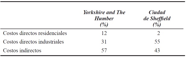 Por otro lado, es notable el hecho de que, mientras en la región de Y&H los costos indirectos representan el 57% del total, en la ciudad de Sheffield éstos sólo representan el 43%. El Cuadro 1 muestra la distribución de los daños en cada región, por categoría. Esto muestra que las perturbaciones a la economía, por los daños materiales, se propagaron en mayor medida en la región de Y&H que en la ciudad de Sheffield.