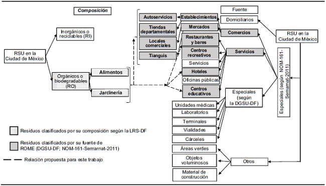 Con base en la fuente de generación, la Dirección General de Servicios Urbanos adscrita a la Sobse clasificó los RSU en: domiciliarios, comerciales (establecimientos y mercados), servicios (restaurantes, bares, centros recreativos, servicios públicos, hoteles, oficinas públicas y centros educativos), especiales (unidades médicas y laboratorios, terminales, vialidades, cárceles) y otros (áreas verdes, objetos voluminosos y materiales de construcción) (JICA-GDF, 1999, p. 9).