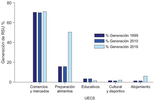 La Figura 2 muestra la tendencia de los sectores de las UECS con potencial de generación de RO, así como sus porcentajes de generación de RSU. El aumento de los giros dedicados a la preparación de alimentos (restaurantes, bares, etc.) llegó a 30%, mientras que los de servicios de alojamiento temporal y los centros culturales y deportivos aumentaron menos de 5% en los últimos seis años. Caso contrario, los comercios (incluyendo mercados y tianguis) se han mantenido, mientras que las escuelas redujeron su generación en menos de 2% respecto al periodo anterior.