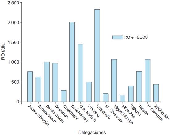Con el fin de identificar cuál era la aportación de RO en UECS por delegación, se presenta la Figura 3, donde se observa que las delegaciones Iztapalapa (7.6%), Cuauhtémoc (6.6%) y Gustavo A. Madero (4.8%) aportan la mayor cantidad de RO por día, en contraposición a Cuajimalpa (1%), La Magdalena Contreras (0.7%) y Milpa Alta (0.6%), con las menores proporciones.