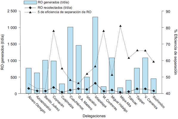 Como se aprecia en la Figura 4, resulta paradójico que las delegaciones con mayor generación estimada de RO para este trabajo, son las que presentan los porcentajes más bajos de eficiencia en la separación, como Iztapalapa, Cuauhtémoc y G. A. Madero. Por otra parte, las delegaciones con menor generación como M. Contreras y Milpa Alta presentan las más altas tasas de eficiencia en la separación de residuos.