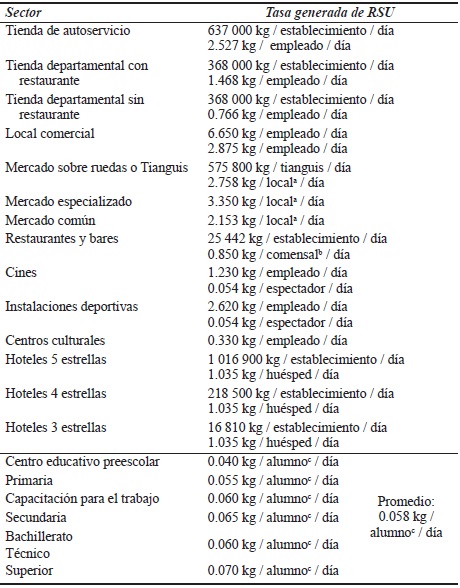 De acuerdo con la propuesta de Lebersorger y Beigl (2011, se recopiló la información estadística sobre las UECS disponible en la página del Instituto Nacional de Estadística y Geografía (INEGI). Para calcular las tasas de generación de RSU por tipo de UECS, se recurrió al método empleado por Purcell y Maguete (2009, pp. 8-9) para la ciudad de Dublín. En el caso de la CDMX, se emplearon las tasas de generación por empleado o huésped o alumno, ofrecidas por el estudio de JICA-GDF (1999, p. 45), cuyos resultados eran detallados y fueron proyectados hasta el año 2010, así como el informe realizado por la Dirección General de Servicios Urbanos de la Sobse (INE, 2007, pp. 2-3). Las tasas de generación de RSU se presentan en el Cuadro 2.
