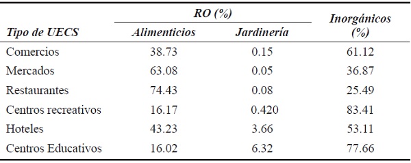 De acuerdo con los resultados, el número total de UECS con potencial generador de RO, registradas en el Directorio DENUE a inicios del 2016, fueron 163 129; lo que representa 39.27% del total. Conforme a las proyecciones de JICA/GDF (1999, p. 45) para el año 2010, se aplicaron los porcentajes de las unidades t/año al total de UECS registradas al primer bimestre de 2016, para obtener una estimación de los RO generados para este trabajo, la cual fue de 14 155 t/d para las 16 delegaciones de la capital.