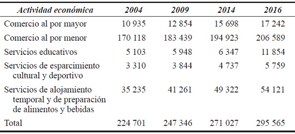 Estos sectores constituían el 18.4% de las actividades económicas del producto interno bruto nacional (PIB). En este sentido, Sobrino (2016, p. 18) apunta a que los censos económicos pueden aportar datos sobre las principales características de las unidades económicas a escala municipal, por lo que es posible referenciar sus cifras de crecimiento a los datos de los últimos censos económicos (2009; 2014), donde se observó un aumento del 4% en el número de unidades económicas dedicadas al comercio. En la misma proporción creció el número de personal ocupado, con una producción bruta total de 10%, lo que reflejaba el crecimiento del sector económico y la estructura de las actividades realizadas (INEGI, 2014). Sin embargo, para el segundo semestre del 2016, el Directorio Estadístico Nacional de Unidades Económicas (DENUE) reportó un aumento en este tipo de unidades de 50.62% respecto al reporte del 2014 (INEGI, 2016a), mientras que la generación de RSU, para el mismo periodo, aumentó menos del 1% (Sedema, 2015, pp. 11, 14). En el Cuadro 1 se muestran estas tendencias.