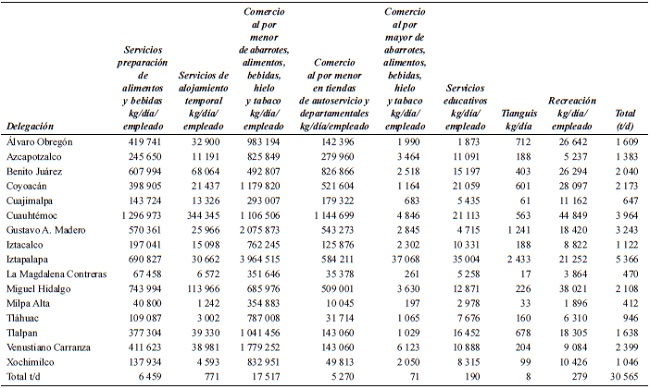 De acuerdo con el Cuadro 5, los resultados obtenidos por delegación, sobre la aplicación de las tasas de generación de RSU por empleado por día, según el número de empleados registrados en el DENUE a inicios de 2016, muestra que la generación estimada de RSU para la CDMX fue de 30 565 t/d, cantidad que sobrepasa a la cifra oficial de 12 893 t/d difundida en el Inventario de Residuos Sólidos 2014, y de 12 843 t/d en el correspondiente a 2015 (Sedema, 2014, p. 11; 2015, p. 11); se consideran todas las fuentes de generación.