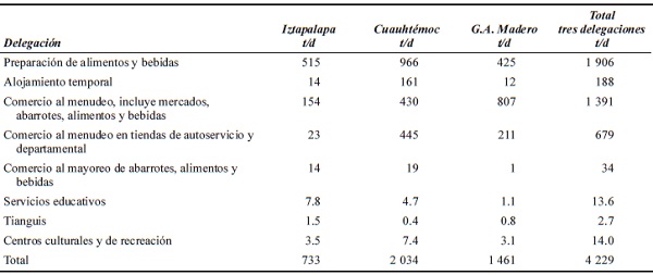 Las tres delegaciones con más aportes a la generación de RO por UECS se presentan con mayor detalle en el Cuadro 6, donde se observa que en la delegación Iztapalapa el comercio de alimentos y bebidas, principalmente, ocupa hasta 70.2%, seguido de las UECS encargadas de venta al por menor de alimentos y bebidas (21%). En la delegación Cuauhtémoc el mayor porcentaje de las UECS está relacionado con la preparación de alimentos y bebidas (48%), con el comercio al menudeo en autoservicios (21.9%) y con el de alimentos (21%). En la delegación Gustavo A. Madero el comercio al menudeo de alimentos alcanza el 55%, seguido de la preparación de alimentos (29%) y el comercio al menudeo en tiendas de autoservicio (14.5%).