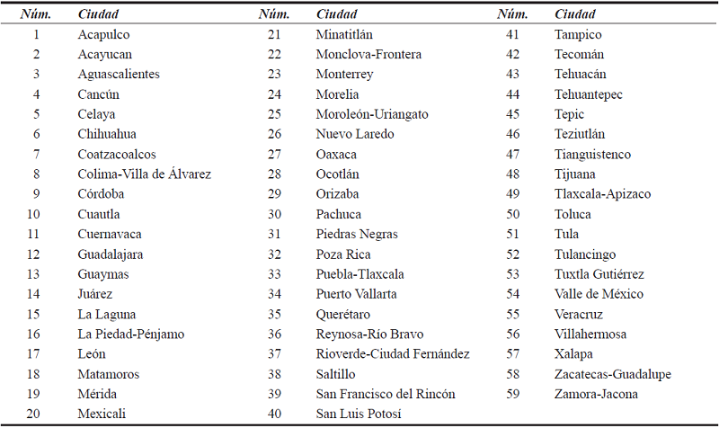 Con base en los argumentos anteriores, se eligieron siete atributos para caracterizar la forma urbana de las ciudades mexicanas: 1) superficie urbana, 2) policentralidad, 3) compacidad, 4) densidad, 5) distribución del empleo, 6) diversidad, y 7) traza urbana. El estudio se basó en el análisis de una muestra de urbes seleccionadas por su diversidad regional, demográfica y económica. Para este efecto, se recurrió a la definición de las ZM desarrollada por Sedesol et al. (2012), la cual arroja como resultado un total de 59 ciudades3 (véase el Cuadro 1).