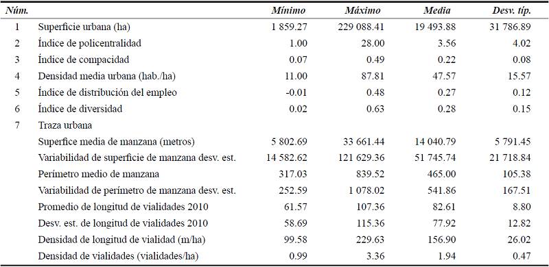 A partir de esta delimitación se construyó una base de datos con los principales indicadores morfológicos antes enumerados. La cartografía digital de las 59 ZM estudiadas comprende información vectorial de la traza urbana, de los polígonos que representan las manzanas y de la red vial. Además, se incorpora información sobre la población y las actividades económicas agregadas en una unidad espacial denominada por el marco estadístico nacional como área geoestadística básica (AGEB). A continuación, se presenta cada uno de los indicadores y los resultados que se obtuvieron del análisis para las 59 ZM.