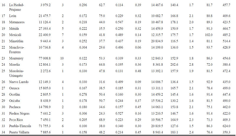 Los resultados de este análisis se reportan en el Cuadro 2. Como se observa, el valor mínimo es de 0.01, lo cual daría cuenta de una distribución desconcentrada, y corresponde a la situación en que se encuentra la ZM de Guaymas. En el otro extremo, el valor máximo es 0.48, que indicaría una situación de concentración, y es el índice de la ZM de Acapulco (véase el Cuadro 3).