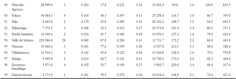 Los resultados indican que el promedio para el conjunto de las 59 ZM es de 156.9 m/ha, siendo la ZM de Tlaxcala-Apizaco la de menor densidad con 99.58 m/ha, y la de Zacatecas-Guadalupe la más densa con 229.6 m/ha.