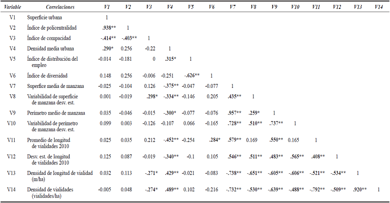 Así pues, la interpretación de los resultados obtenidos permite distinguir tres grandes procesos espaciales que estructuran y dan forma a las ciudades. Éstos son independientes y se manifiestan a dos escalas: local y metropolitana. El primer proceso, a nivel local, que se distingue en las ciudades, se refiere a la traza urbana y, por ende, a la configuración vial y el tamaño y forma de sus manzanas. A nivel metropolitano se observan dos procesos: el primero se refiere a la macroforma y estructura urbana, que involucra la superficie, la policentralidad y la compacidad; el segundo está vinculado con la distribución del empleo y la diversificación de la actividad urbana.